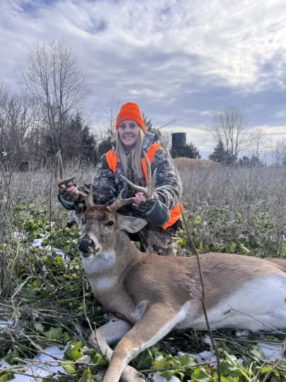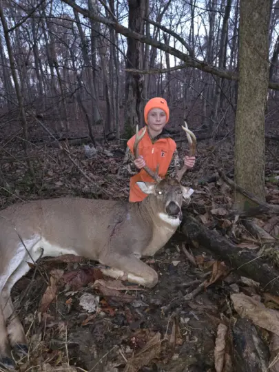 It was my daughters first year hunting. She is 12 years old. Her dad took her and she waited patiently through the rain the first day with no movement. The 2nd day she was in her blind for a few hours before an 8 point came out infront of her. He went into the woods and came back out before she was nervously able to get a shot. First shot and he laid right down for her. She is the happiest kid ever!