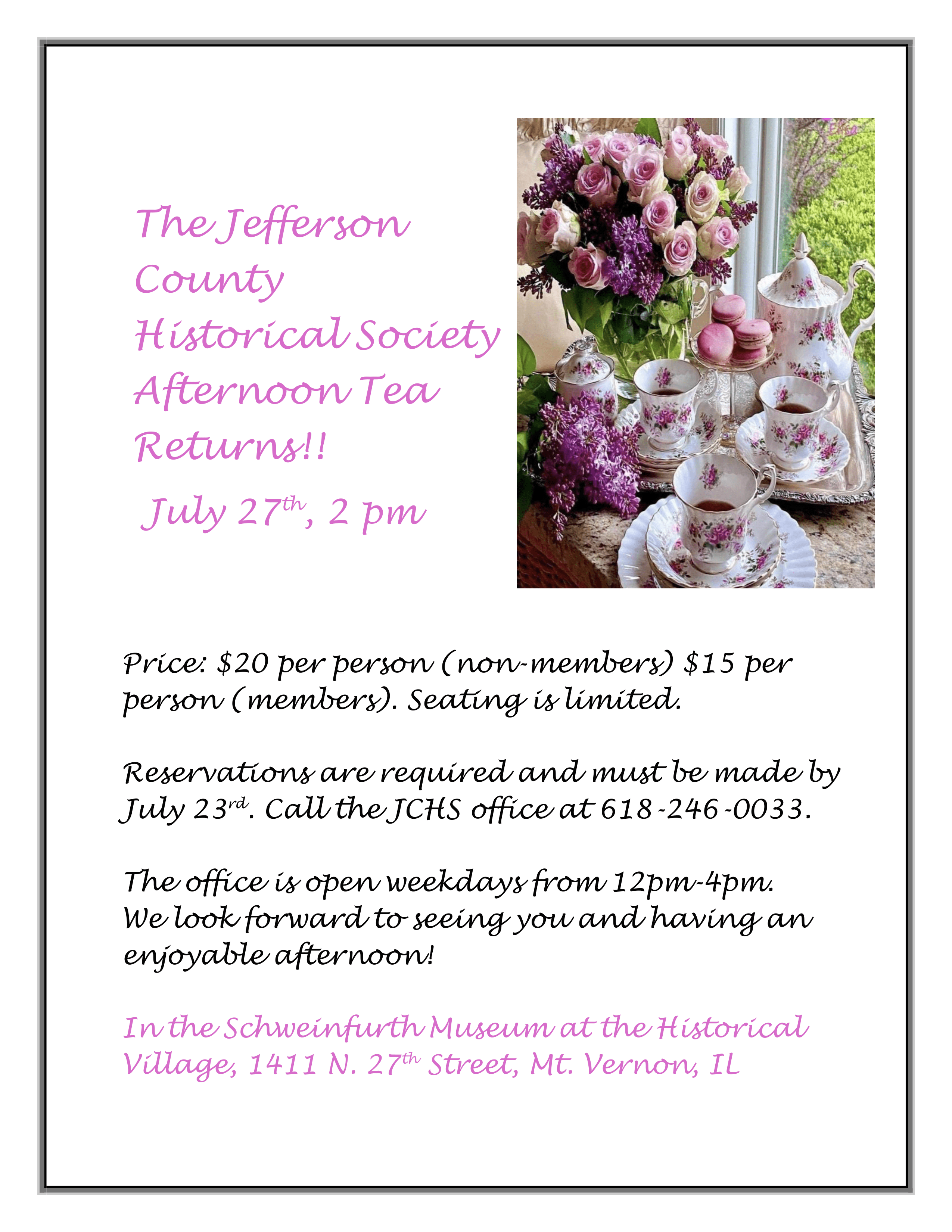 The price is $20 per person for non-members and $15 per person for JCHS members. Seating is limited. Reservations are required and must be made by July 23rd. Call the JCHS office at 618-246-0033. The office is open weekdays from 12pm-4pm.