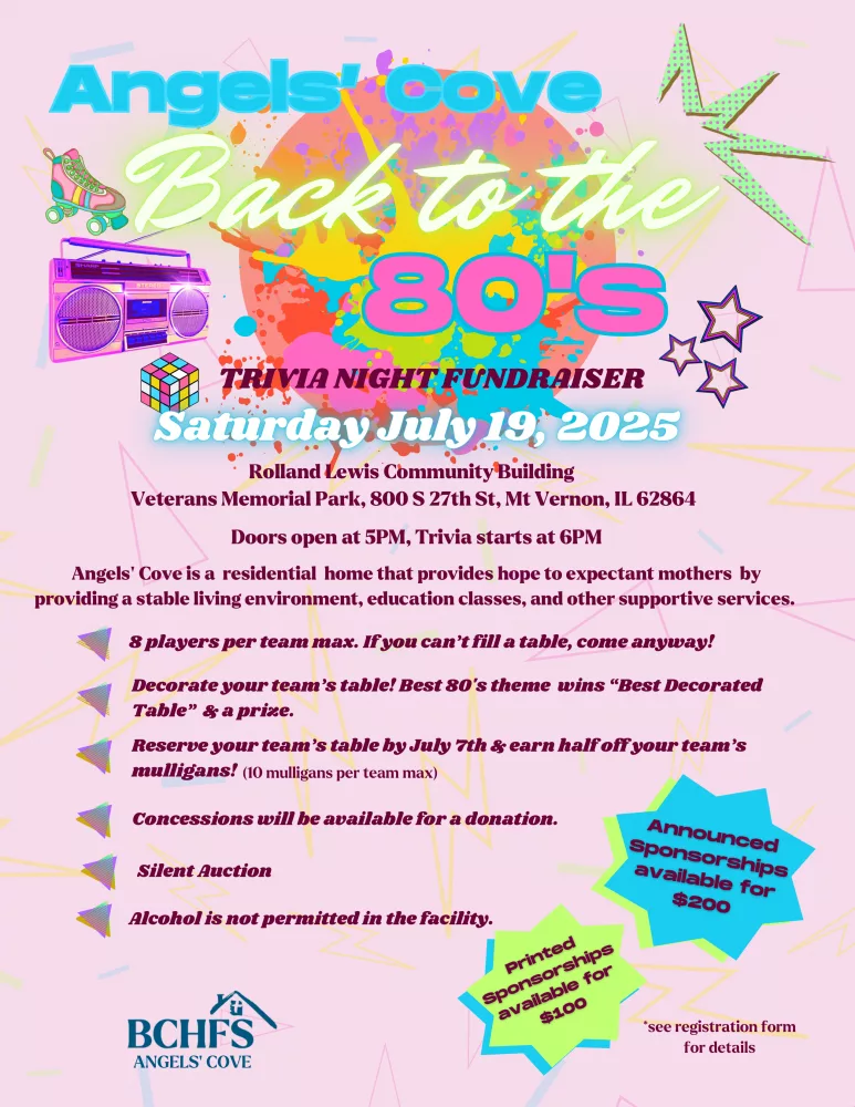 Angels’ Cove Maternity Home is having an 80s-themed Trivia Night fundraiser. All the money raised will help Angels’ Cove Maternity Home to be able to provide supportive care for pregnant women over the age of 18 years old. Doors will open at 5 p.m., and trivia will start at 6. Teams will consist of up to 8 players, and the cost is $20 per player. Food and drinks will be provided for a donation. There will also be a silent auction. Teams are encouraged to register before July 7th to earn half off their team’s mulligans. Teams are also encouraged to decorate their tables! The best 80s-themed table will win a prize! You can reserve a table by emailing alecia.schnaiter@bchfs.com or calling (618) 382 – 4164 EXT 3100