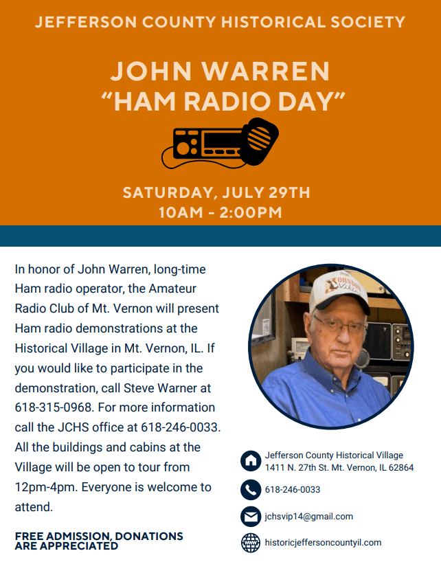 Ham radio demonstrations will be given by the Amateur Radio Club of Mt. Vernon. If you would like to participate in the demonstration call Steve Warner at 618-315-0968. Everyone is welcome to attend.
