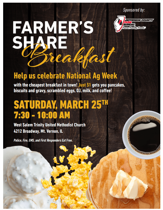 Mt. Vernon, Ill.—The Jefferson County Farm Bureau will host a $1.00 Farmer’s Share Breakfast on Saturday, March 25th from 7:30 to 10 a.m. at West Salem Trinity United Methodist Church in Mt. Vernon.  A breakfast of scrambled eggs, pancakes, biscuits and gravy, orange juice, milk and coffee will be served from 7:30 a.m. to 10 a.m.  Cost will be just $1.00!  The $1.00 represents approximately the average income received by a farmer for the agricultural commodities in a breakfast purchased at a restaurant.  This year, all proceeds raised from this breakfast will go towards the Jefferson County Farm Bureau Ag in the Classroom (AITC) program. AITC teaches lessons to school children throughout Jefferson County about the importance of agriculture in our every day lives.
