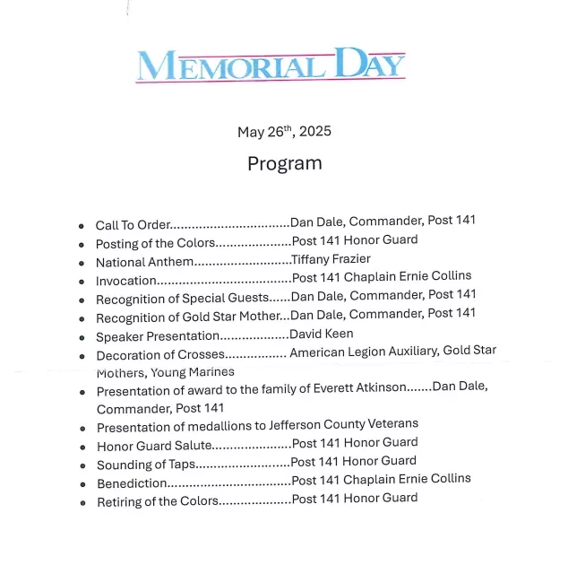 Hosted by the Mt. Vernon American Legion Post #141 on the Jefferson County Courthouse lawn starting at 10am on Monday, May 26.