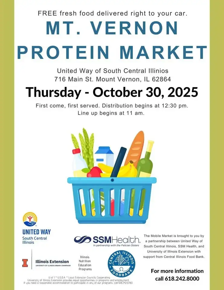 Mt. Vernon Mobile Market – FREE Fresh Food Drive-Thru United Way of South Central Illinois, 716 Main St., Mt. Vernon, IL Thursday, Oct 30, 2025 Distribution starts at 12:30 PM – Lineup begins at 11:00 AM