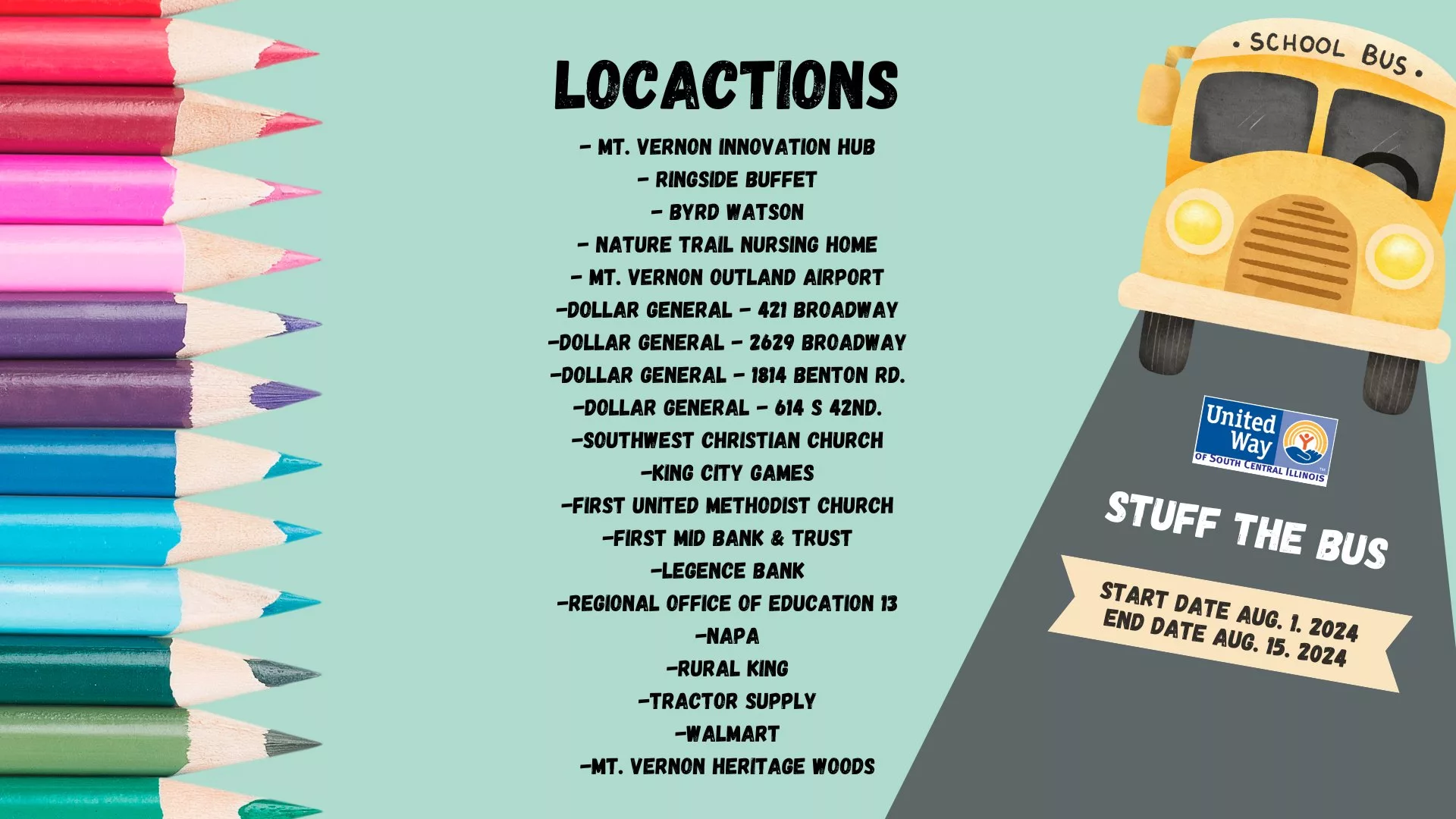 United Way of South Central Illinois is excited to announce our annual “Stuff the Bus” program, and we need YOUR help to make it a success! From August 1st to August 15th, we will be collecting school supplies to benefit Jefferson County Area Schools.